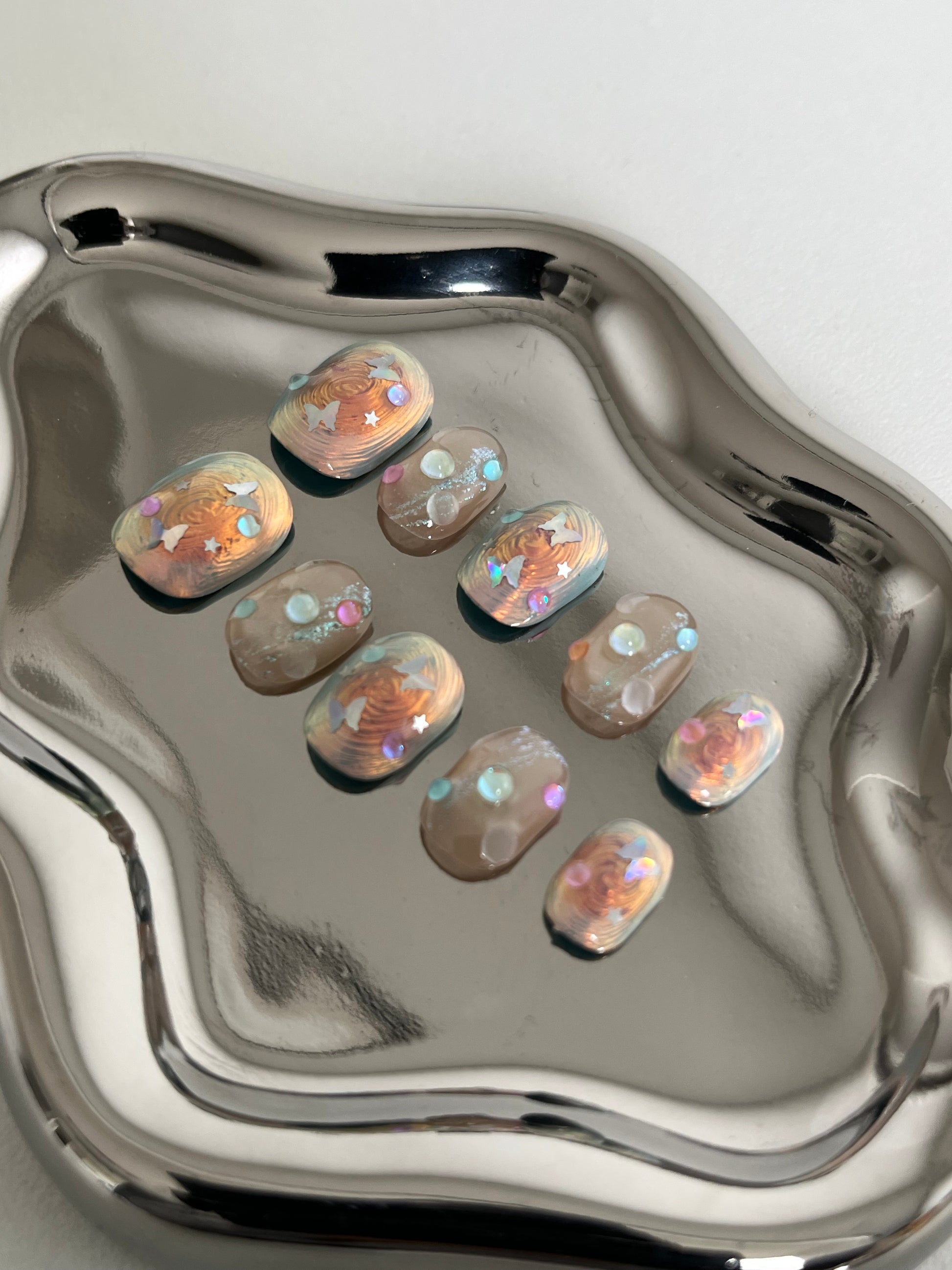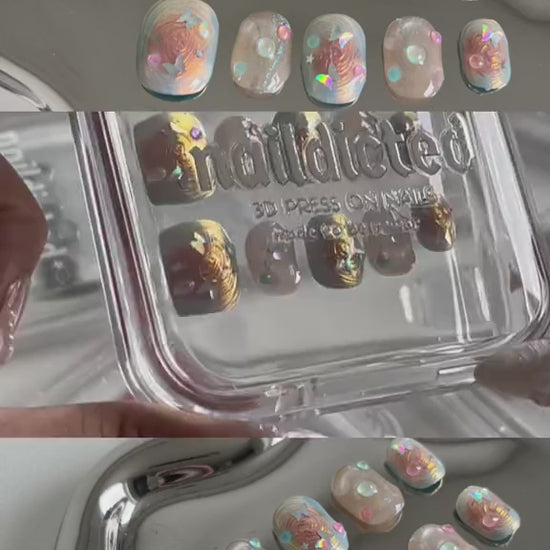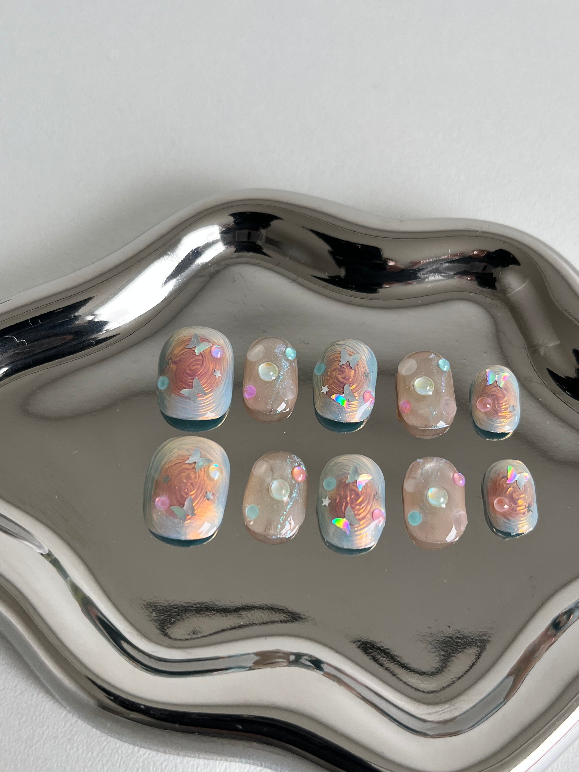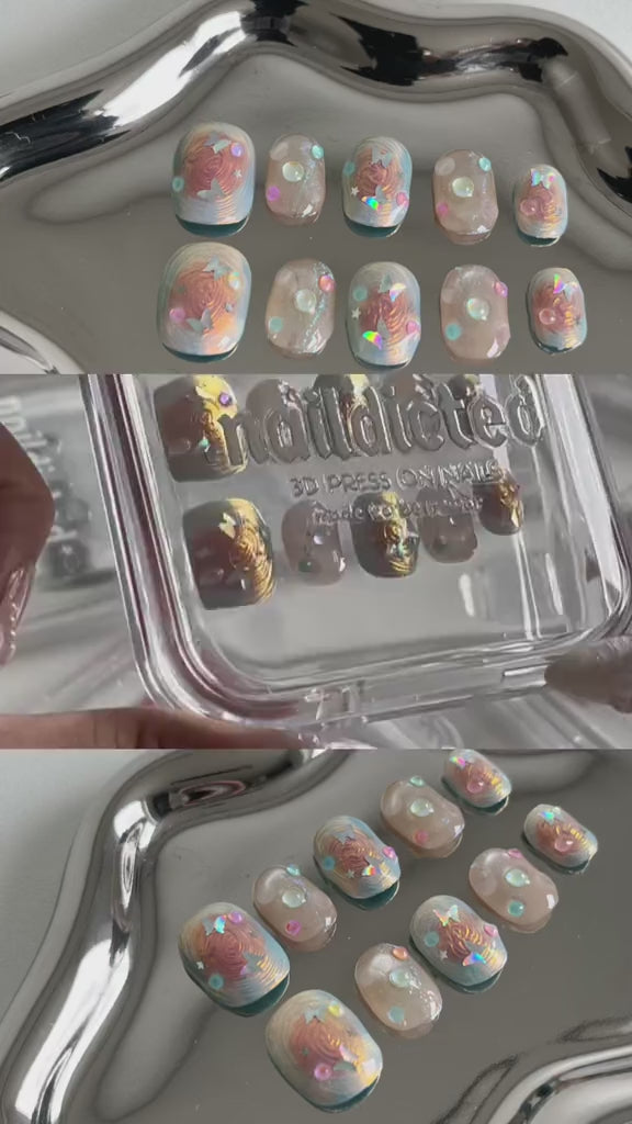 Short dreamy press on pastel nails with 3D pearls, star decals, and holographic shine.