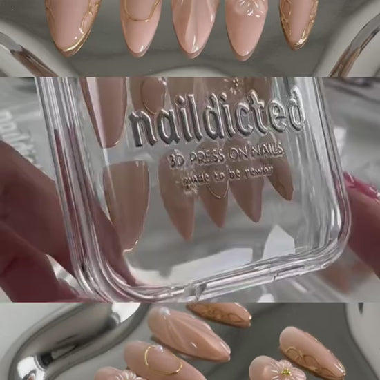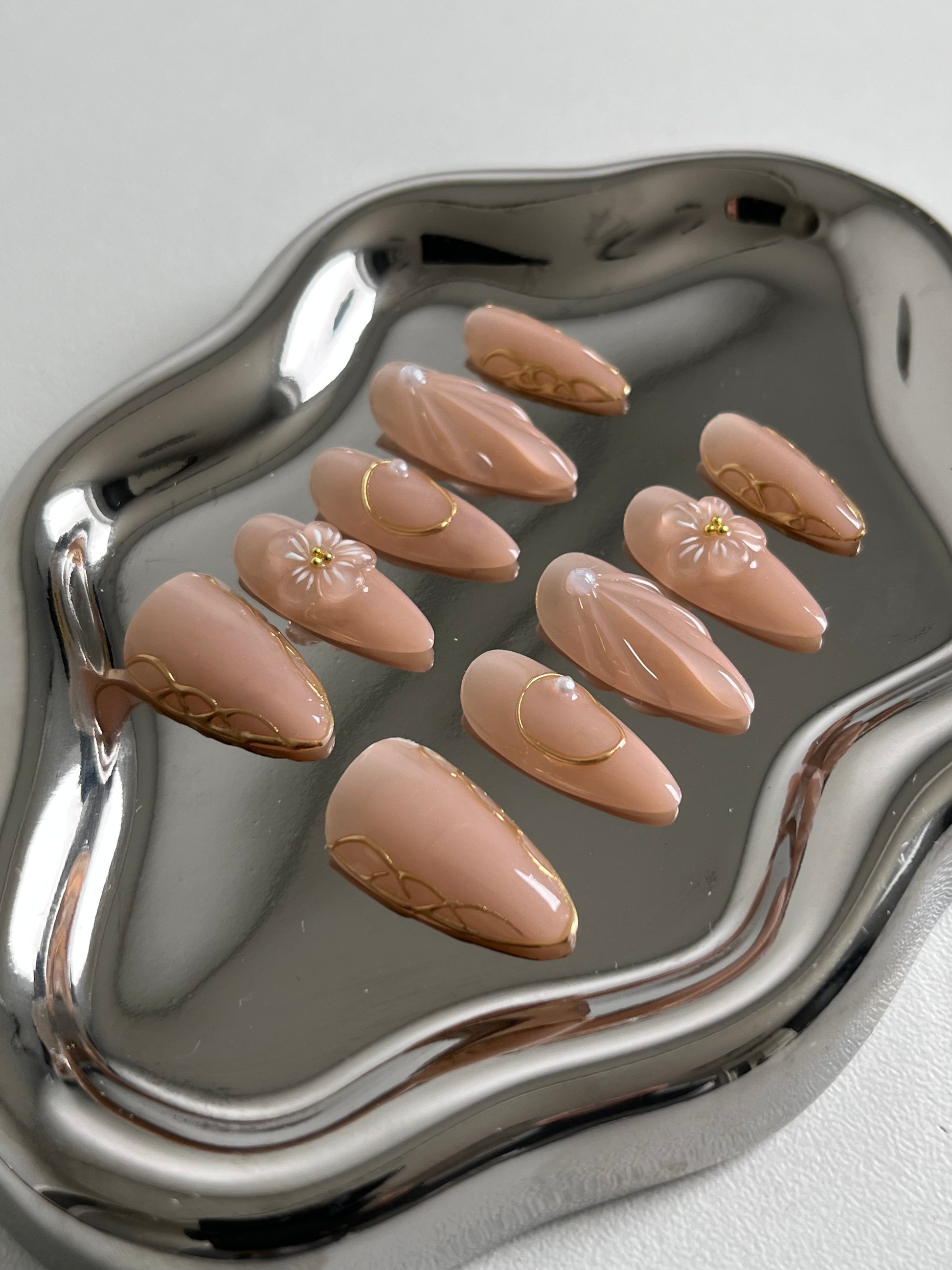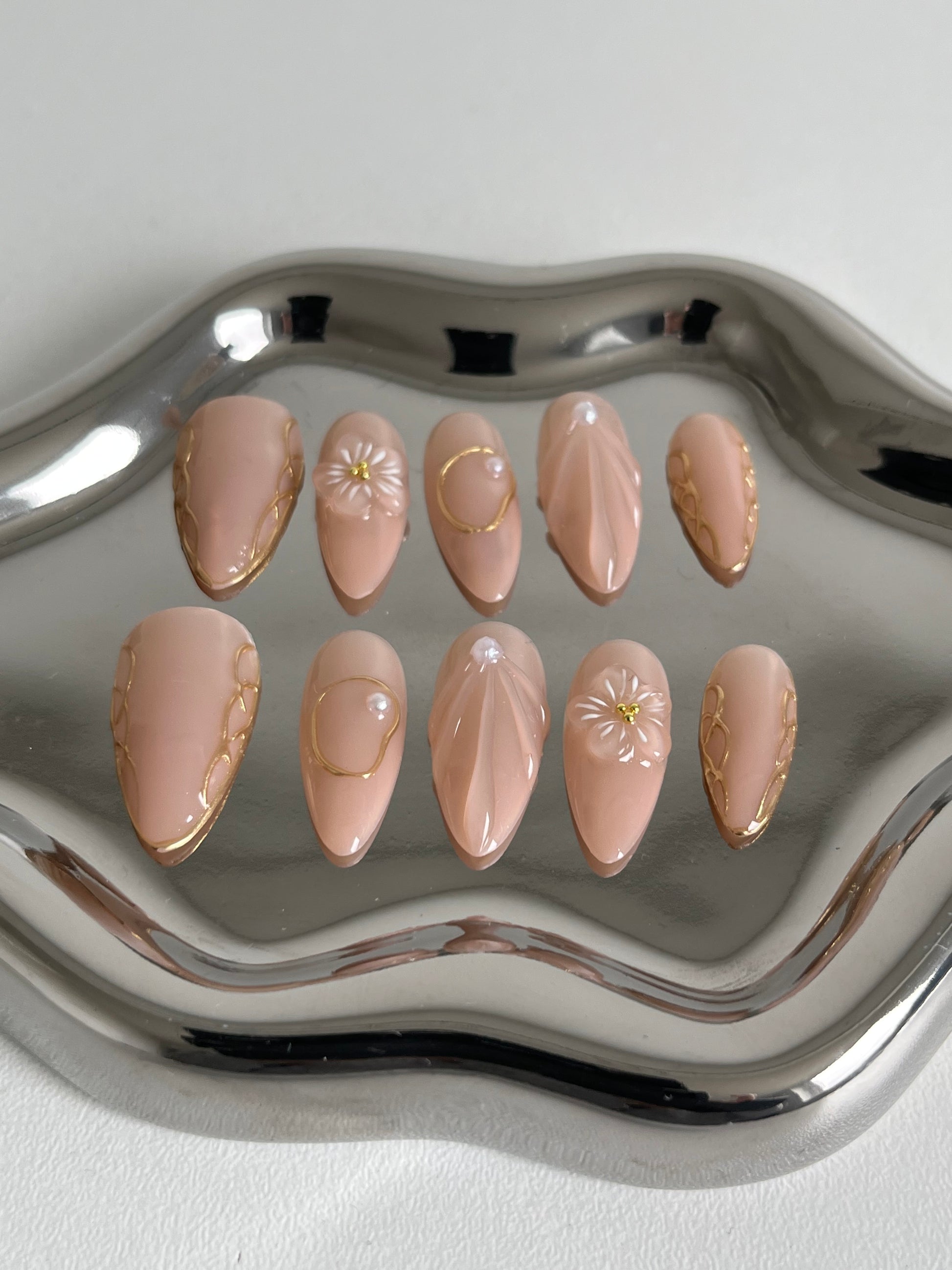 Long almond shaped nude press ons with gold detailing and spring inspired flowers.
